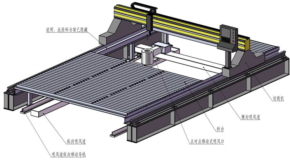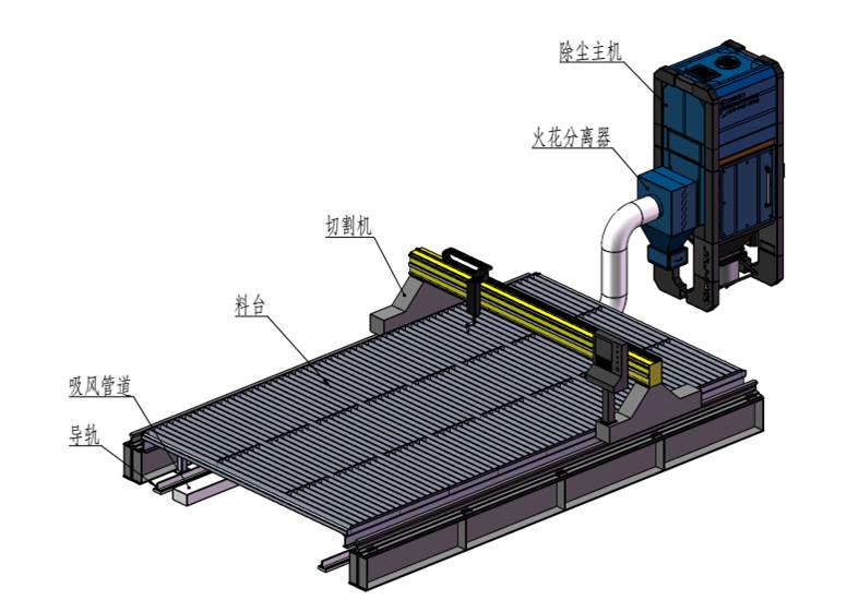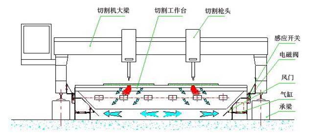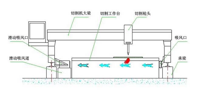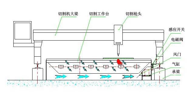下吸式煙塵凈化系統(tǒng)抽風是通過下吸式抽風切割臺來實現的,下吸式抽風切割臺分成若干個區(qū)域,每個區(qū)域設計有風門吸風,切割槍頭在每個區(qū)域切割時,相應區(qū)域的風門打開抽風,將切割機的粉塵吸除。